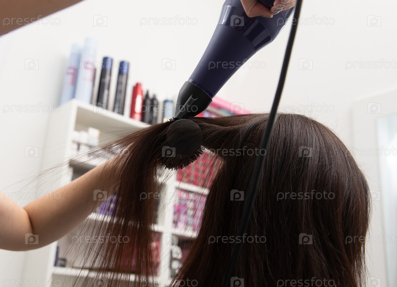 Женщина в парикмахерской сушит волосы феном. На заднем плане полки с большим выбором красок для волос