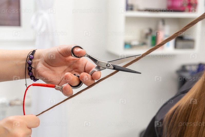 Профессиональный стилист-парикмахер держит расческу и горячие термические ножницы, стрижущие кончики длинных прямых прядей волос крупным планом