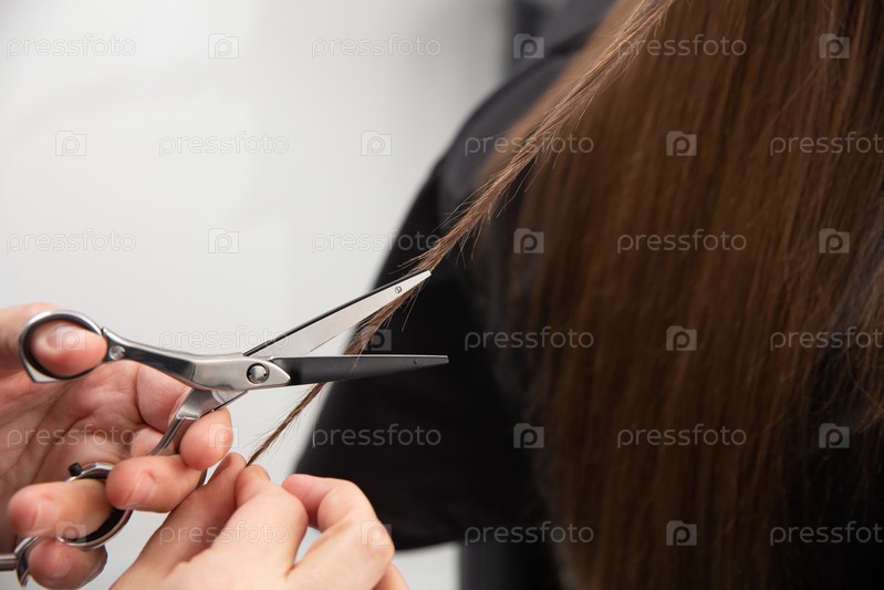 Профессиональный стилист-парикмахер держит расческу и горячие термические ножницы, стрижущие кончики длинных прямых прядей волос крупным планом