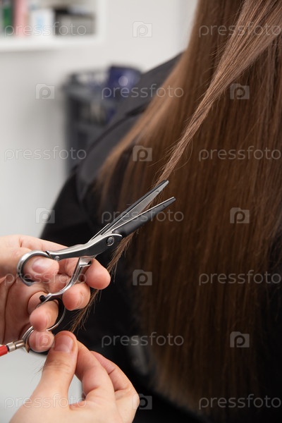 Профессиональный стилист-парикмахер держит расческу и горячие термические ножницы, стрижущие кончики длинных прямых прядей волос крупным планом