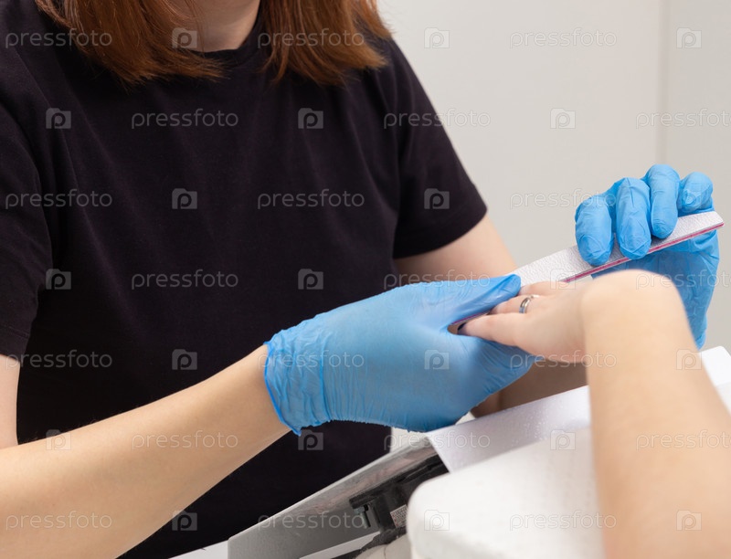 Мастер салона красоты делает девушке маникюр. Мастер подпиливает ногти пилочкой на руке