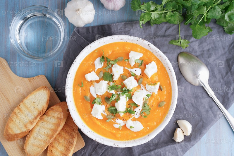 Суп-пюре из тыквы с фетой, диетический вегетарианский обед на синем деревянном столе, вид сбоку. Стакан воды, тост, петрушка, чеснок