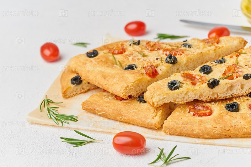 Фокачча, пицца, нарезанная итальянская лепешка с помидорами, оливками и розмарином. Вид сбоку, пространство для копирования