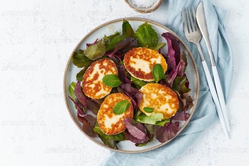 Жареный кипрский халлуми с салатным миксом и свекольным ботом. Lchf, пеган, fodmap, палео, scd, кето, кетогенная диета. Сбалансированное питание, рецепт чистого питания. Вид сверху, белый фон, пространство для копирования