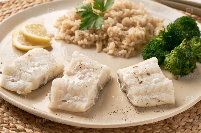 Здоровая еда, полная витаминов и минералов, треска и рис с брокколи