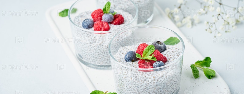 Баннер с чиа-пудингом со свежими ягодами, малиной, черникой. Три стакана, светлый фон, вид сбоку, цветы