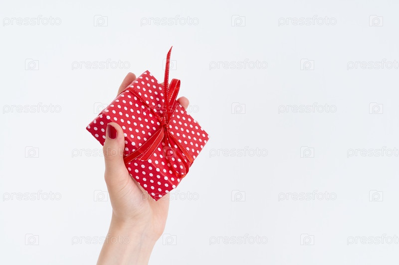 Руки красивой женщины держат красный подарок с лентой, руки с блеском красного лака для ногтей, концепция на белом фоне