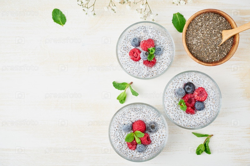 Чиа-пудинг, вид сверху, пространство для копирования, свежие ягоды малины, черники. Три стакана, светлый деревянный фон, цветы, крупный план