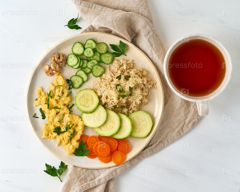 Чистое употребление коричневого риса с цуккини и омлетом с морковью и петрушкой, вид сверху крупным планом