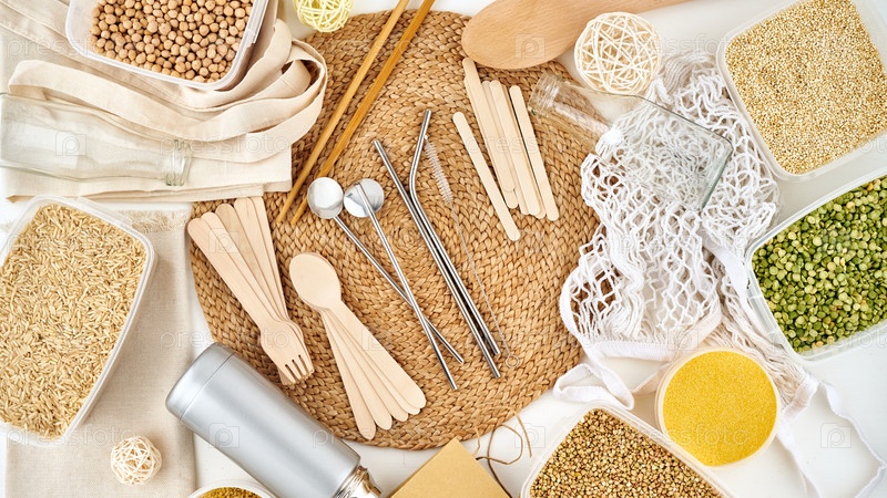 Концепция нулевых отходов. Продукты многоразового использования, без глютена. Натуральные материалы, экологически чистая упаковка без пластика. Никакого чрезмерного потребления, защитите планету от мусора. Вид сверху