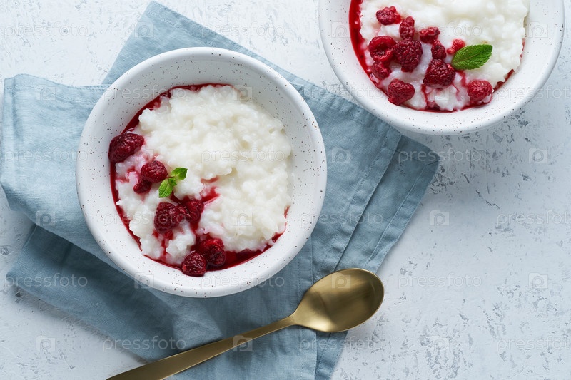 Веганский кокосово-рисовый пудинг. Веганский диетический завтрак с кокосовым молоком, малиной, скандинавским минимализмом, видом сверху, копией пространства