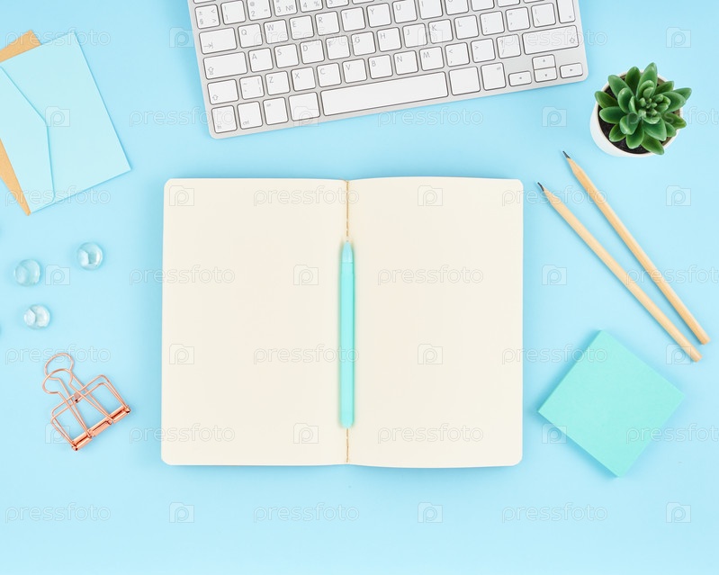 Пустая страница блокнота для текста на синем рабочем столе офиса. Вид сверху на современный яркий стол с ноутбуком и клавиатурой. Макет, копирование пространства