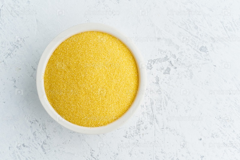 Кукуруза, полотенца в белой миске на белом фоне. Сушеные крупы в чашке, веганская еда, диета fodmap. Вид сверху, крупный план
