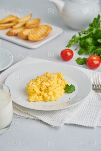 Яичница, омлет. Завтрак с яичницей, стаканом молока, помидорами на белом фоне. Вертикальный