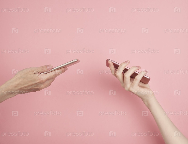 Две женские руки держат смартфон, связь между устройствами, пастельно-розовый фон, вид сбоку
