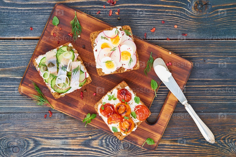 Сморреброд – традиционные датские бутерброды. Черный ржаной хлеб с рыбой, сельдью, яйцом, помидорами, редисом на темно-коричневом деревянном фоне