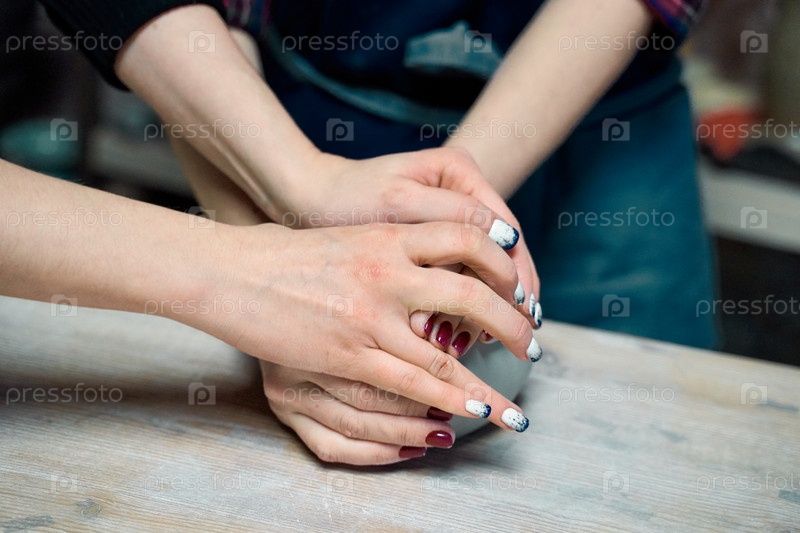 Женщина делает керамическую керамику, четыре руки крупным планом, фокусируются на гончарах, ладонях с керамикой, концепции мастер-класса и мастер-класса. Работа, основанная на навыках
