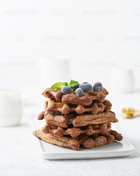 Шоколадно-банановые вафли с черникой на белом столе. Вид сбоку, вертикальный