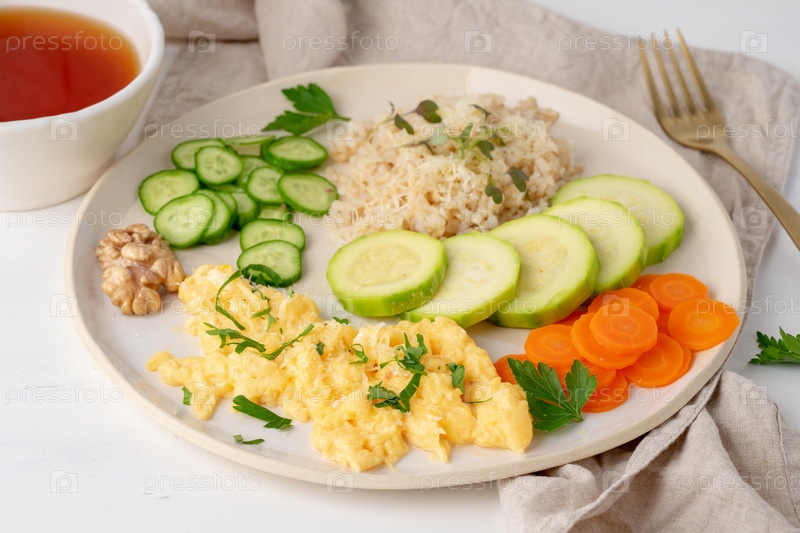 Чистое употребление коричневого риса с цуккини и омлетом с морковью и петрушкой, вид сверху крупным планом