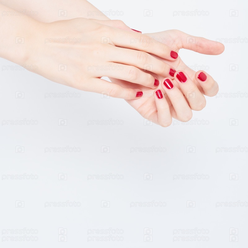 Молодые женские руки с красивым красным лаком для ногтей с глянцевым блеском, уход за кожей рук, спа-терапия для женщин, копировальное пространство на белом фоне