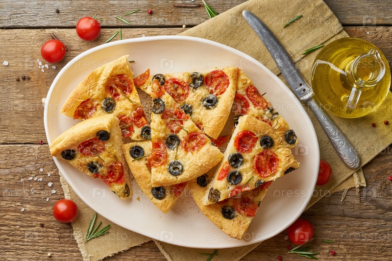 Фокачча, пицца в тарелке с помидорами, оливками и розмарином. Нарезанные итальянские лепешки, вид сверху, деревянный стол