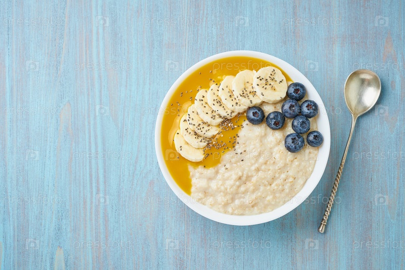 Овсянка с бананами, черникой, семенами чиа, вареньем на синем деревянном фоне. Вид сверху, пространство для копирования. Здоровый завтрак