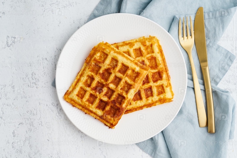 Чаффл, кетогенная диета, здоровое питание. Домашние кето вафли с яйцом и сыром моцарелла. Без глютена и углеводов. Белый фон