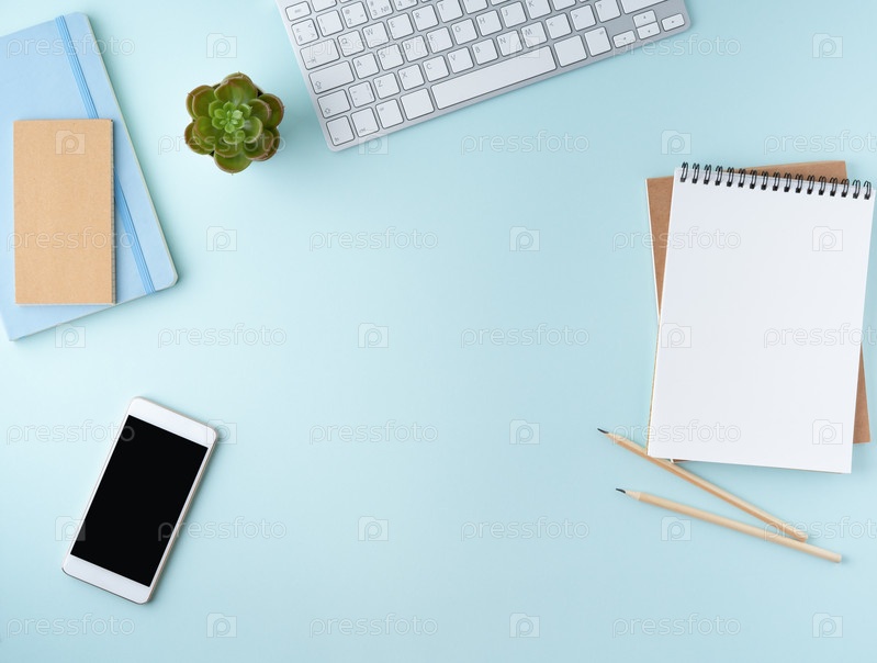 Вид сверху современного синего офисного рабочего стола с пустым блокнотом, компьютером, смартфоном. Макет
