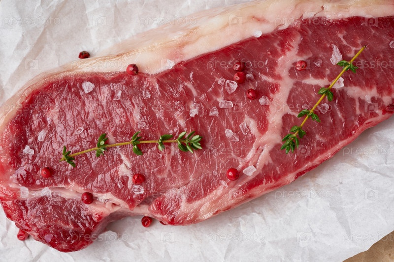 Большой цельный кусок сырой говядины, стриплойн на белой пергаментной бумаге на крафтовом фоне, упаковка без отходов. Приправа стейка солью, макрос