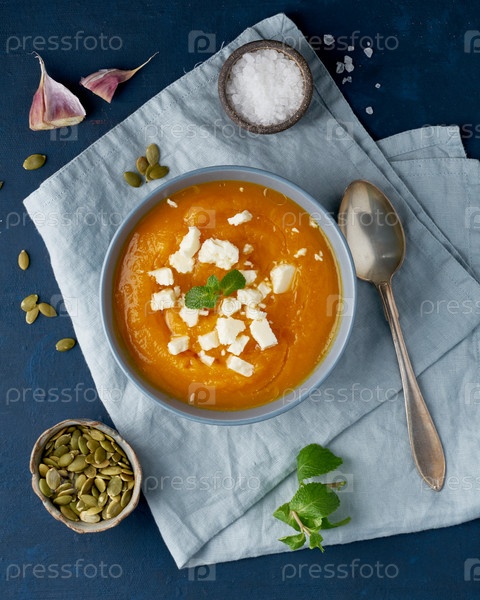 Тыквенный крем-суп с овечьим сыром, осенняя домашняя еда, темно-синий фон, вид сверху, вертикаль. Диета Фодмап, лчф. Вегетарианское меню, рецепт чистого питания
