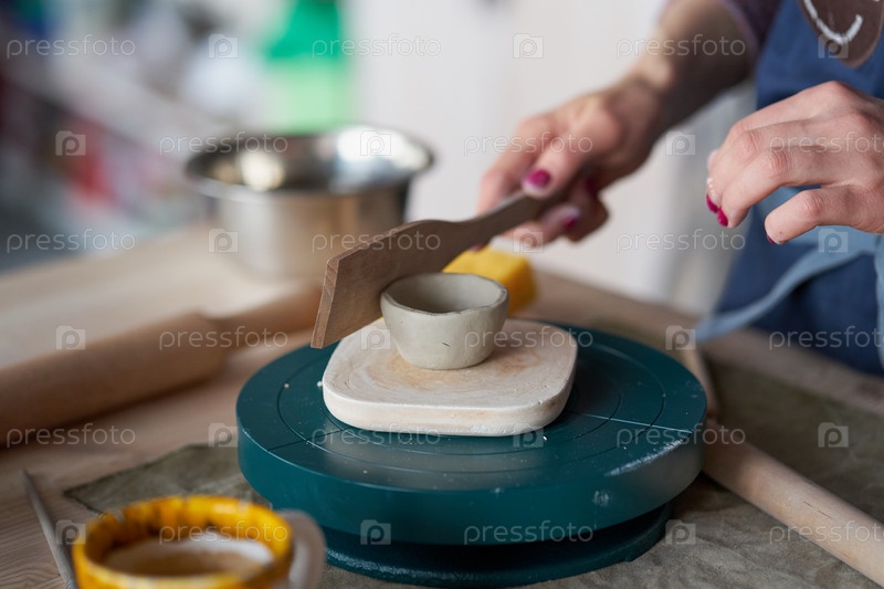 Женщина занимается гончарным делом, руки крупным планом, размытый фон, фокус на гончарах, ладони с керамикой