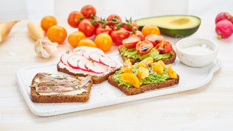 Набор смерребродов с рыбой, анчоусами, авокадо, помидорами, редисом. Вид сбоку, белый фон
