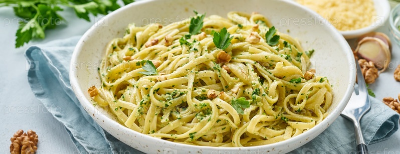 Баннер с пастой песто, баветте с грецкими орехами, петрушкой, чесноком, орехами, оливковым маслом