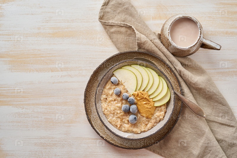 Овсянка, полезная каша в большой миске с фруктами и ягодами на завтрак, чашка какао. Вид сверху, пространство для копирования