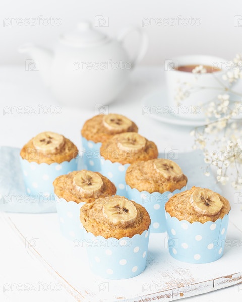 Банановый кекс, кексы в синей бумаге для тортов, белый бетонный стол