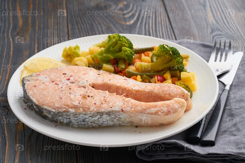 Паровой лосось и овощи, здоровое питание. Белая тарелка на деревенском деревянном столе, вид сбоку