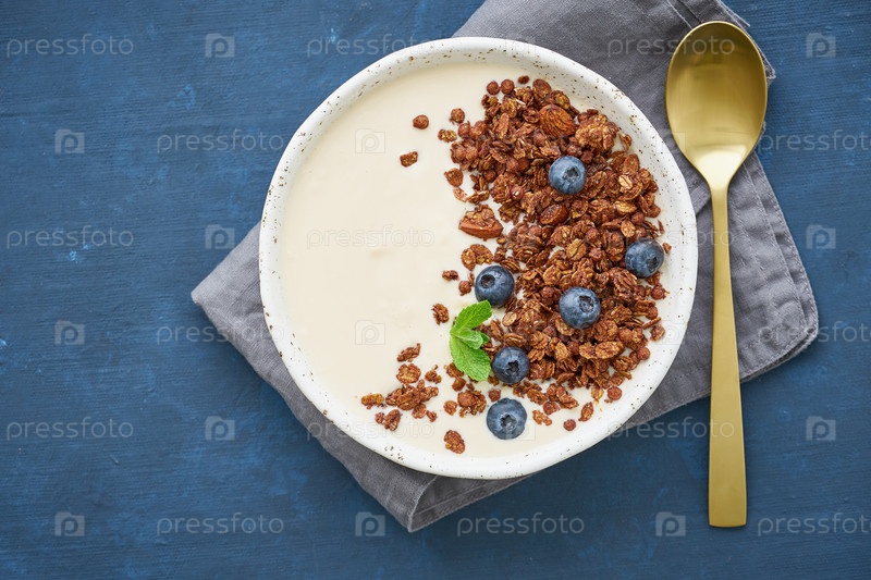 Йогурт с шоколадной гранолой, черникой. Завтрак на синем ярком столе, вид сверху, пространство для копирования