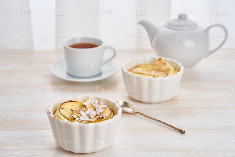 Яблочный пирог и чашка чая на белом деревянном столе на кухне. Нежный творожный десерт с яблоками, миндальными хлопьями и корицей, вид сбоку