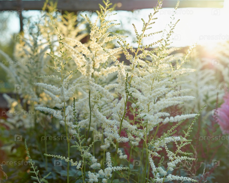 Красивый куст цветов Астильбы с пушистыми белыми метелками, крупным планом