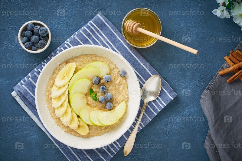 Овсянка с бананами, черникой, вареньем, медом, синей салфеткой на фоне голубого камня. Крупный план, вид сверху