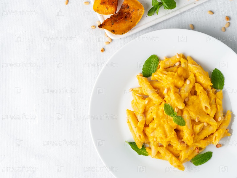 Тыквенная паста пенне со сливочным соусом из запеченной тыквы на белом фоне, вид сверху, пространство для копирования