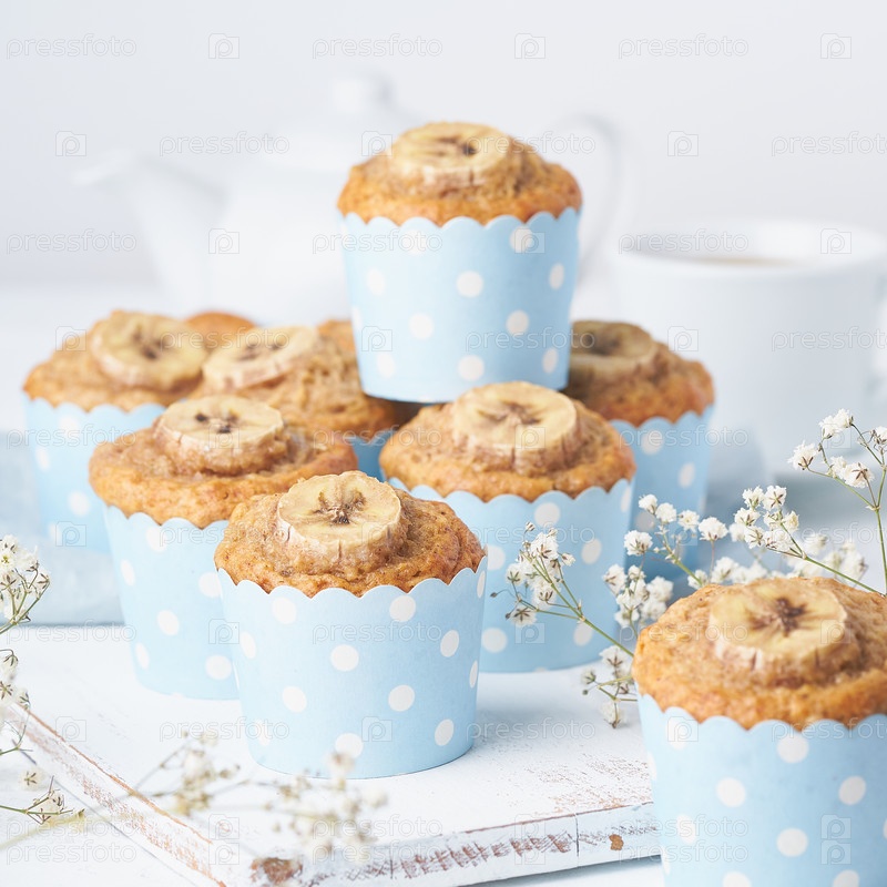 Банановый кекс, кексы в синей бумаге для торта, вид сбоку. Утренний завтрак на белом бетонном столе