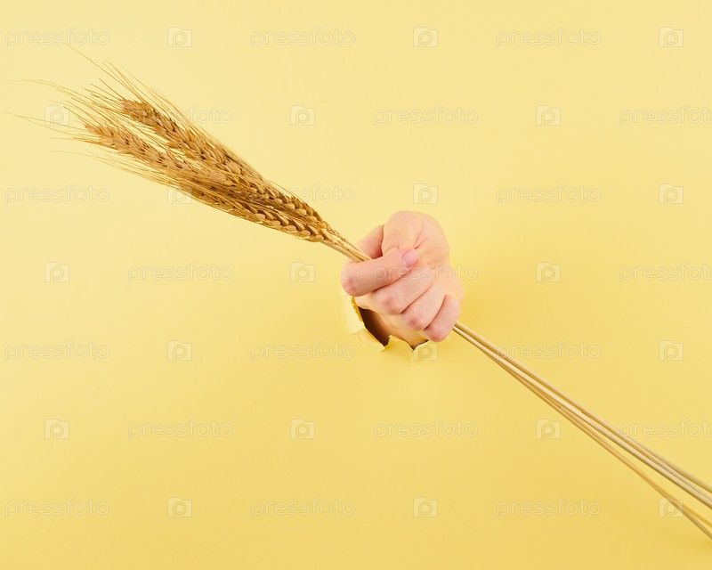 Женская рука с колоском в лопнувшей дыре, концепция силы сельского хозяйства
