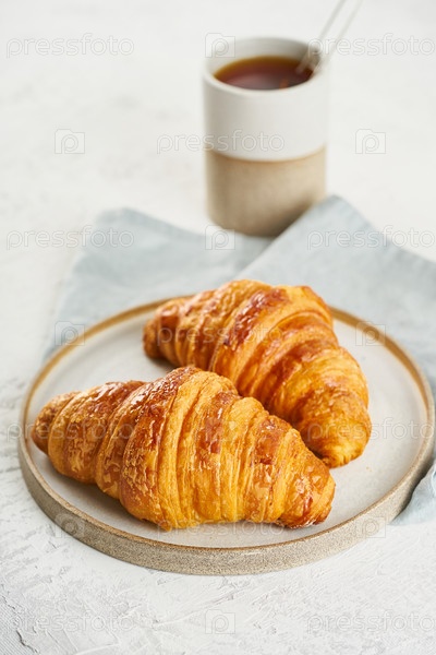 Два вкусных круассана на тарелке и горячий напиток в кружке. Утренний французский завтрак со свежей выпечкой. Светло-серый фон, вертикальный