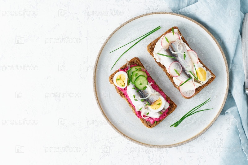 Пикантный смерреброд — два традиционных датских сэндвича. Черный ржаной хлеб с анчоусами, свеклой, редисом, яйцами, сливочным сыром на серой тарелке на белом каменном столе, место для копирования