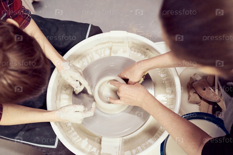 Женщины делают керамическую керамику, концепция мастер-класса и мастер-класса, крупный план в четыре руки, внимание к гончарам, ладони с керамикой. Две женщины. Концепция творческого хобби, подработка. Вид сверху