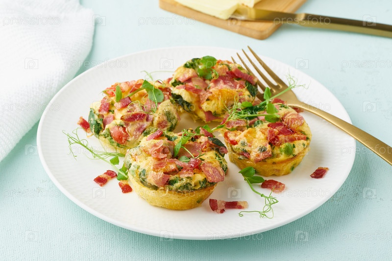 Яичные кексы со шпинатом и беконом, кетогенная кето-диета с низким содержанием углеводов, пастель и современный фон крупным планом
