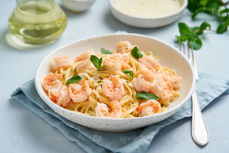 Паста-спагетти с жареными креветками, соусом бешамель, мятным листом на синем столе, итальянская кухня, вид сбоку
