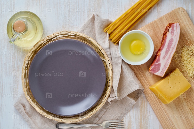Ингредиенты для рецепта пасты Карбонара - спагетти, бекон, яйцо, сыр пармезан, пустая тарелка. Вид сверху, светло-бежевый деревянный фон