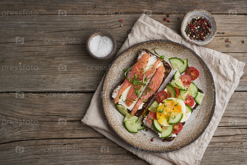 Сморреброд – традиционные датские бутерброды. Черный ржаной хлеб с лососем, сливочным сыром, огурцом, помидорами на деревянном столе, место для копирования, вид сверху